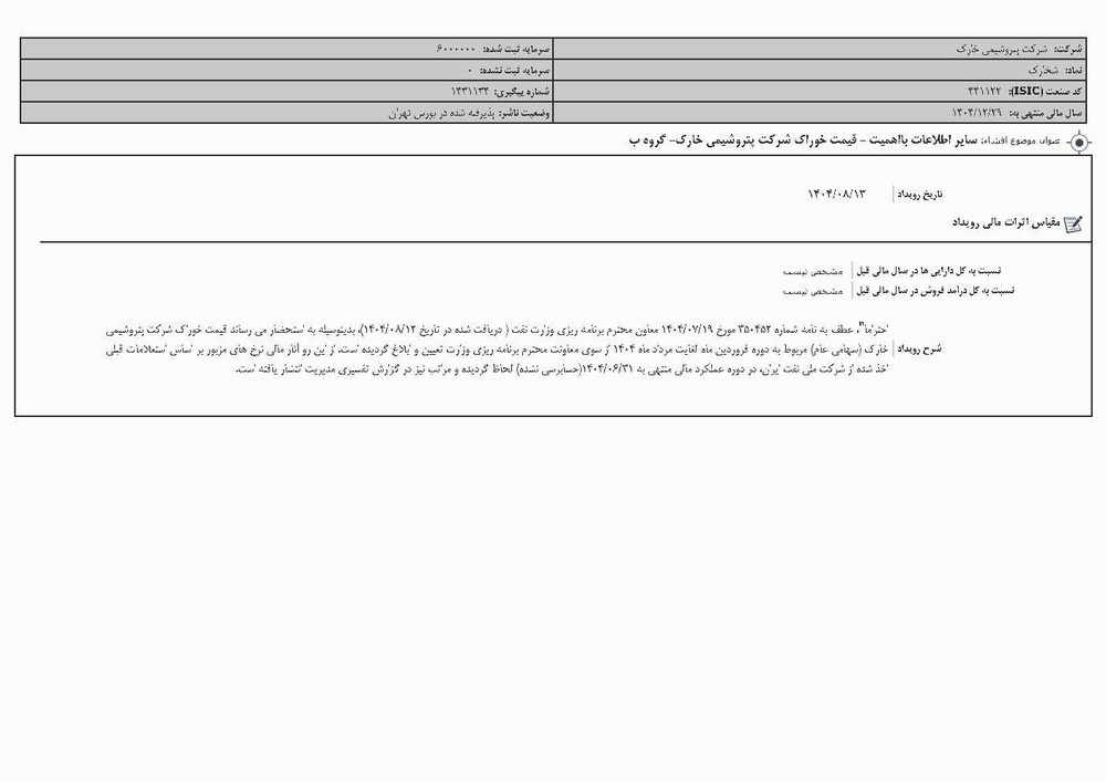 افشای اطلاعات بااهمیت - (سایر اطلاعات بااهمیت - قیمت خوراک شرکت پتروشیمی خارک- گروه ب) منتهی به سال مالی ۱۴۰۴۱۲۲۹