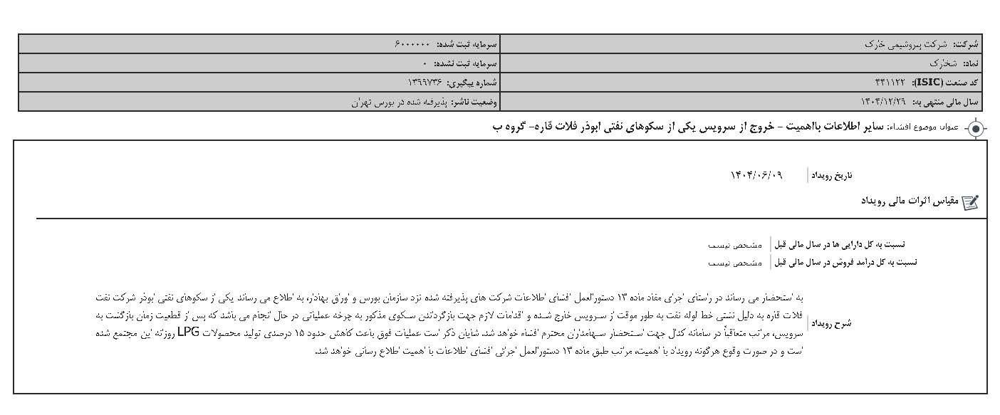 افشای اطلاعات بااهمیت - (سایر اطلاعات بااهمیت - خروج از سرویس یکی از سکوهای نفتی ابوذر فلات قاره- گروه ب) منتهی به سال مالی 14041229